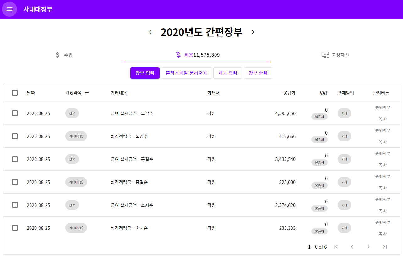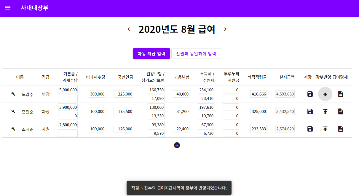 장부반영 버튼을 누르면 간편장부에 해당월의 해당 직원 인건비 내역이 반영됩니다.